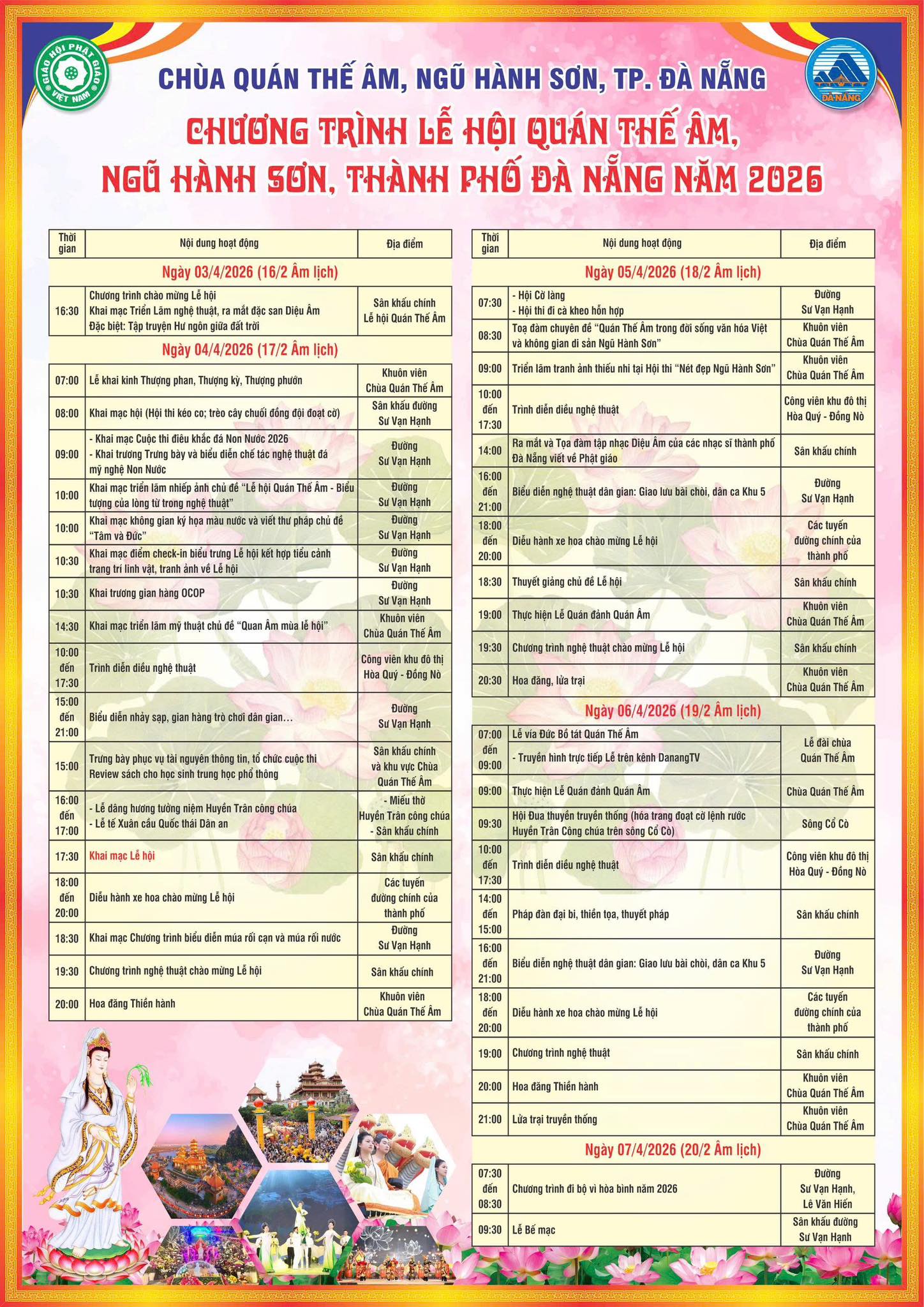 Lễ vía Đức Bồ Tát Quán Thế Âm: Diễn ra vào sáng 06/4 (19/2 âm lịch) – đây là nghi lễ quan trọng nhất, cầu nguyện quốc thái dân an, hòa bình và hạnh phúc.