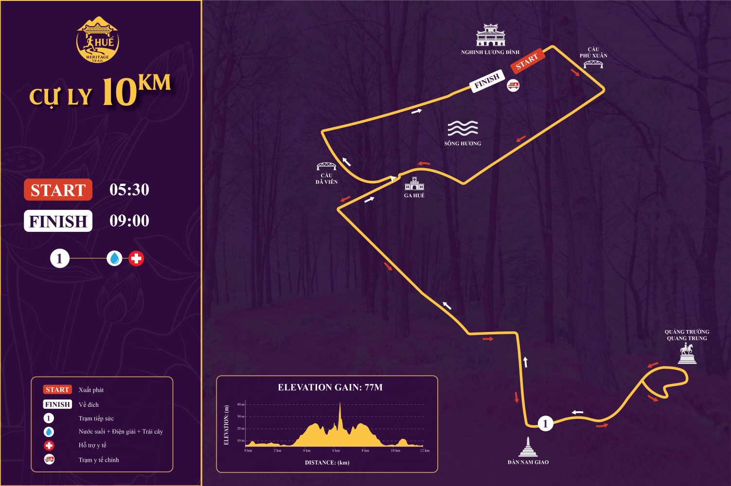 Cự ly mang tinh thần nhẹ nhàng, 10km là bước khởi đầu lý tưởng để bạn chạm vào hồn Huế – dịu dàng mà sâu sắc. Độ cao thấp, cung đường nhẹ nhàng, phù hợp với người mới bắt đầu, hoặc nhóm bạn, gia đình yêu Huế và muốn trải nghiệm nhẹ nhàng. Vận động viên sẽ băng qua những biểu tượng văn hóa – lịch sử ngay trung tâm thành phố: Nghinh Lương Đình, Trường Quốc Học, Đàn Nam Giao, và chinh phục núi Bân.