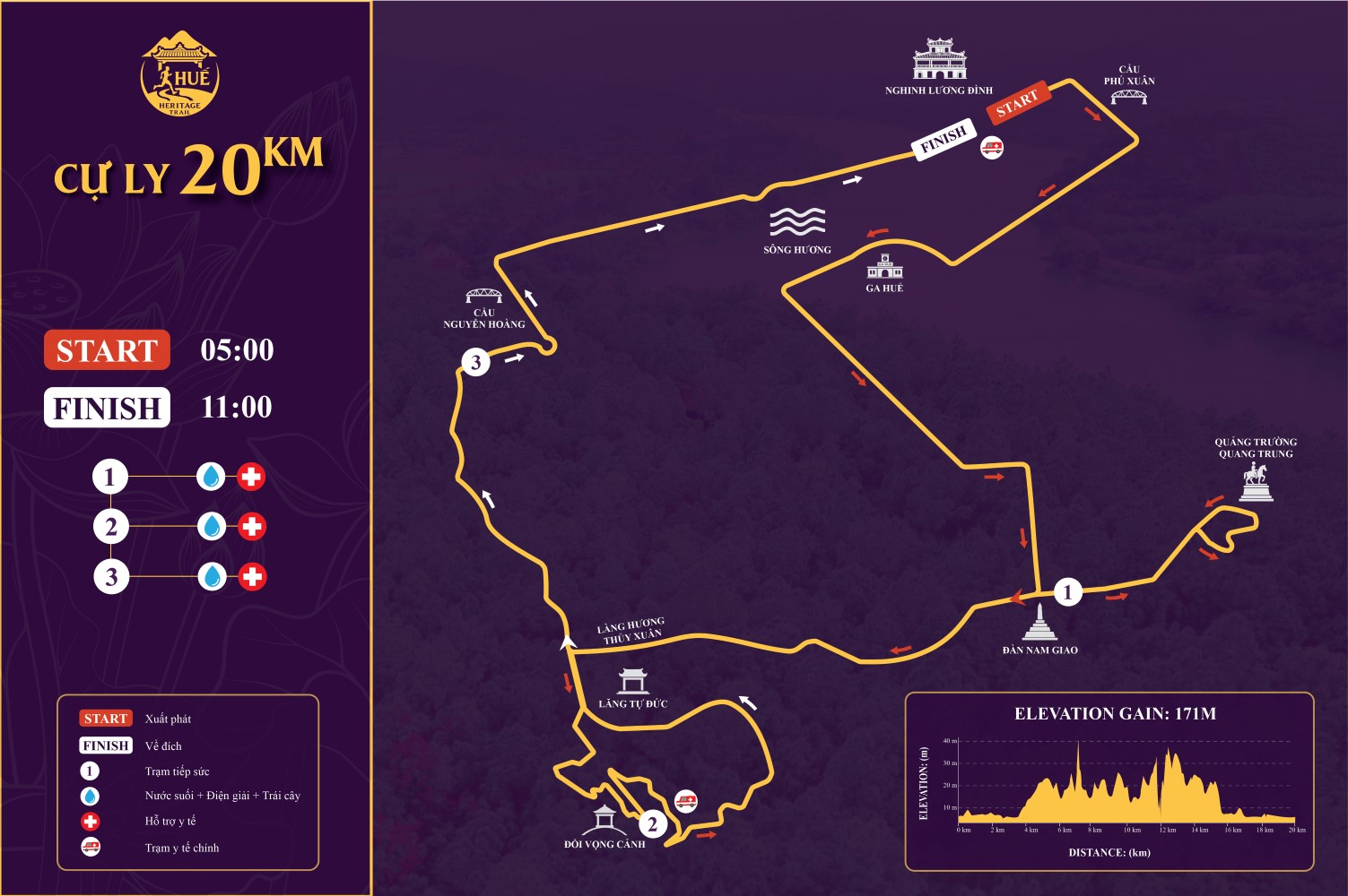 Mang tinh thần giao thoa giữa thành phố và thiên nhiên, 20km là cung đường dẫn lối qua những địa danh vừa cổ kính, vừa nên thơ. Độ cao tăng nhẹ, cung đường này kết hợp cả phố cổ và đồi thông lãng mạn, phù hợp với vận động viên ưa trải nghiệm phong cảnh vừa lãng mạn vừa cổ kính như Nghinh Lương Đình, Quốc Học Huế, Đàn Nam Giao, Núi Bân, Đồi Vọng Cảnh, Lăng Tự Đức, Cầu Nguyễn Hoàng. Gợi cảm giác tìm về nét xưa và ngắm nhìn di sản bằng trái tim lắng đọng.
