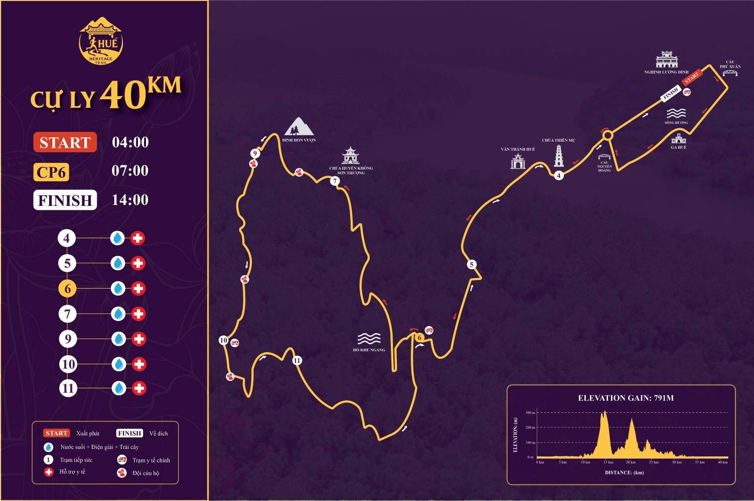 Đậm chất "trail khám phá", cự ly 40km kết nối thiên nhiên nguyên sơ và chiều sâu văn hóa của Huế mình. Địa hình trail nhẹ, có dốc và xuyên rừng. Dành cho những trái tim yêu mạo hiểm, muốn hòa mình vào không gian xanh và lắng nghe tiếng vọng của rừng thiêng Cố đô. Vận động viên sẽ chạy qua: Chùa Thiên Mụ cổ kính, Văn Thánh, Hồ Khe Ngang trong xanh, và một phần đỉnh Hòn Vượn.