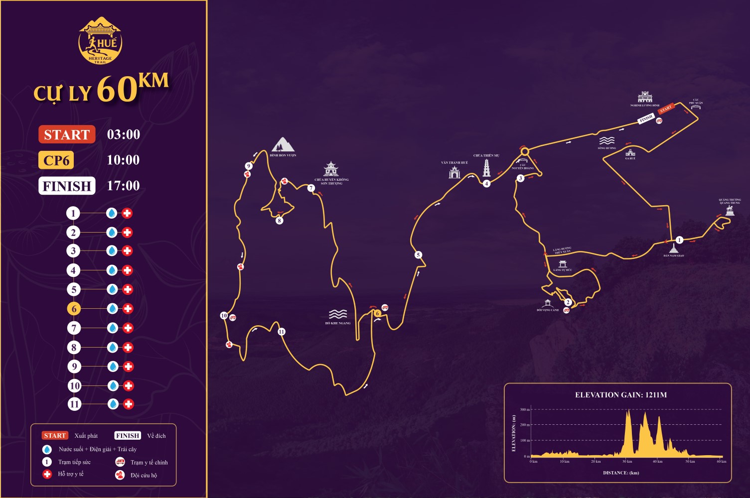 Cự ly cao nhất và thử thách nhất của Huế Heritage Trail 2025. Với độ cao thay đổi lớn, 60km dành cho những vận động viên thực thụ – mang trong mình ý chí bền bỉ và khát vọng đi đến tận cùng chiều sâu di sản. Hành trình xuyên suốt từ Nghinh Lương Đình, đến Núi Bân, Đồi Vọng Cảnh và khám phá trọn vẹn rừng thiêng Hòn Vượn– kết nối toàn bộ linh hồn của Huế bằng đôi chân và ý chí của vận động viên.